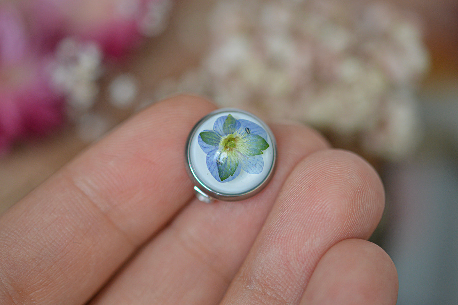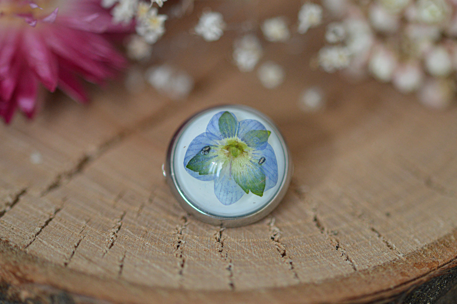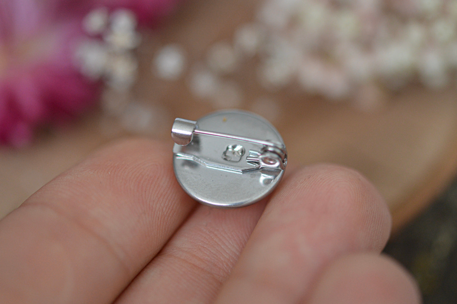 Eine natürliche Brosche mit einer echten Veronika. Das Material ist mit Epoxidharz eingebettet, die Metallkomponenten bestehen aus Edelstahl. Der Durchmesser der Brosche beträgt 1,4 cm.